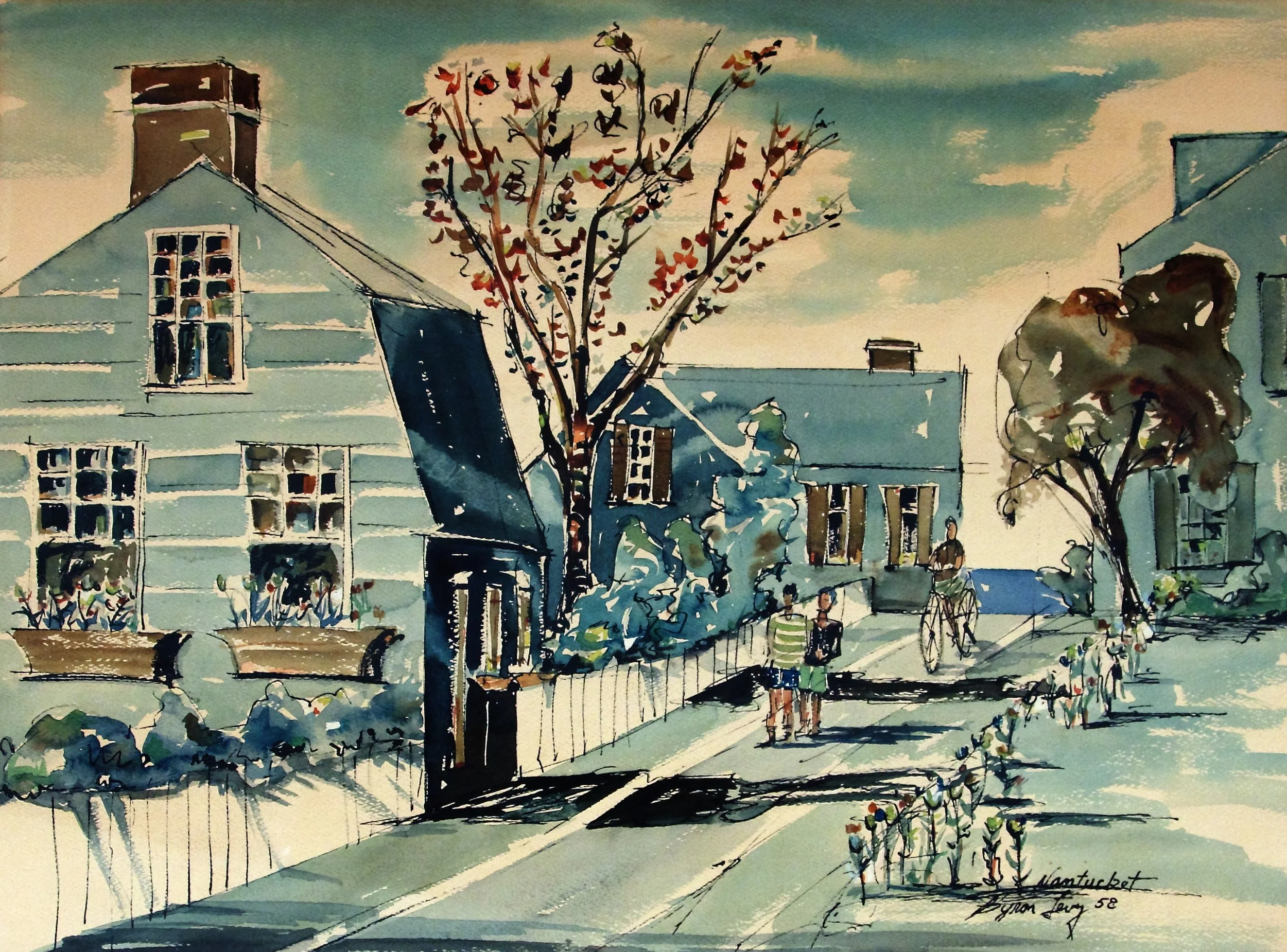Occasional trips to New England provided Byron with fresh subject matter, very, very different from scenes in New Orleans and southern Louisiana. This large painting of Nantucket from the late 1950s was done on one such trip. It was evidently a family favorite — Byron’s mother (my grandmother) — had it framed and placed prominently in her house, where it remained for almost 50 years (Byron’s sister, my aunt, lived in the house, with the painting in the same spot, until Hurricane Katrina in 2005).
